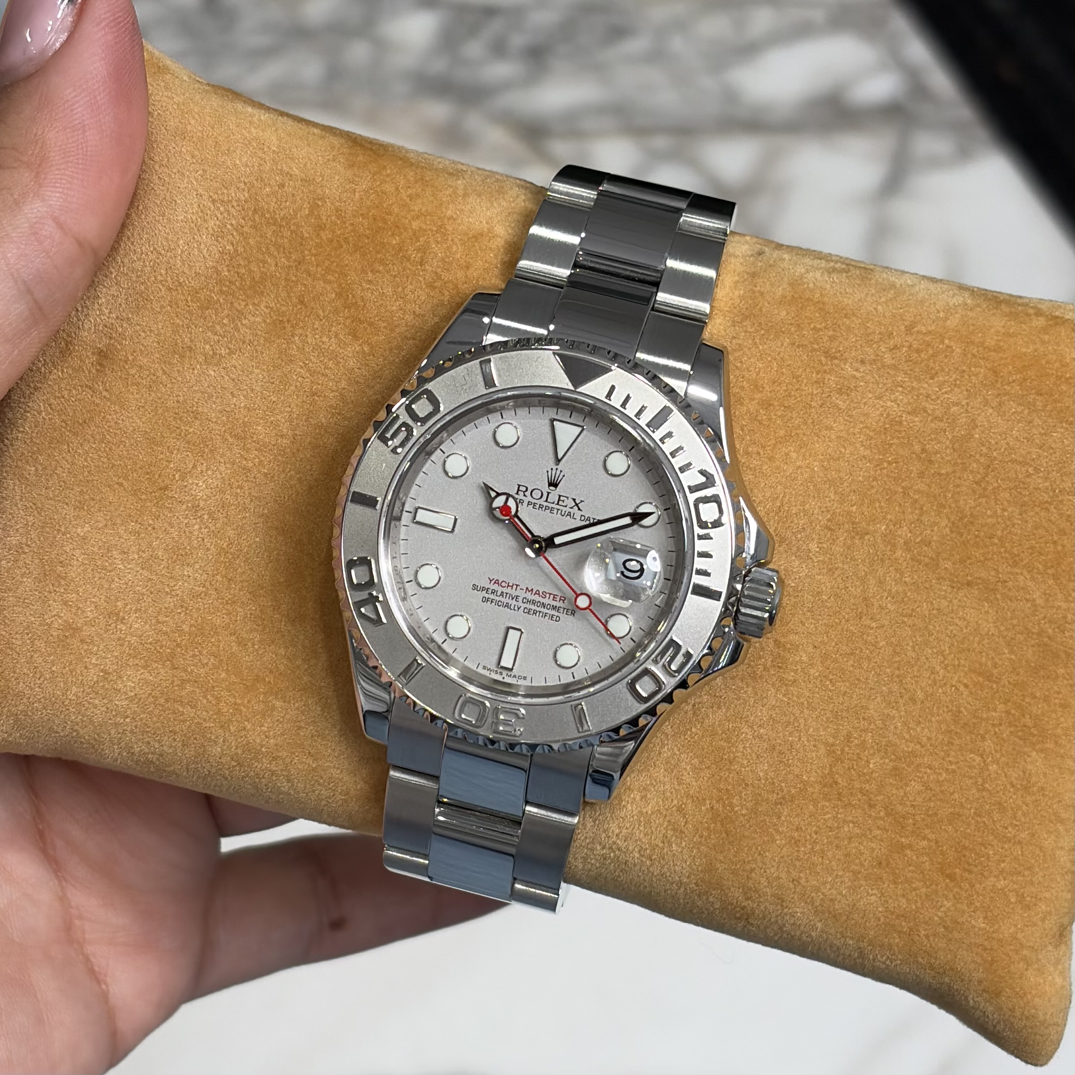 The Rolex Yacht-Master 40mm 16622 (2000) is a refined sport-luxury timepiece distinguished by its platinum Rolesium bezel and shimmering sandblasted platinum dial. Housed in a 40 mm stainless steel case and paired with a comfortable Oyster bracelet, it offers the perfect blend of nautical elegance and everyday versatility. Powered by the reliable Rolex Caliber 3135, it delivers precise performance with classic Yacht-Master styling. This example is in like-new condition and comes complete with its original box and papers - short 1 link.